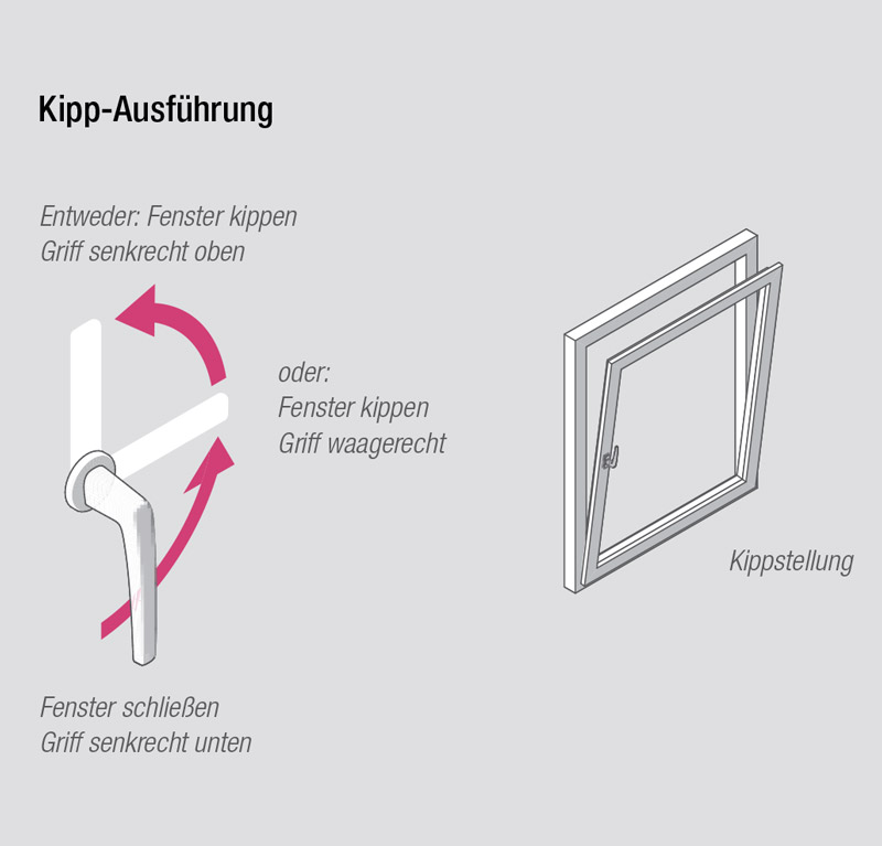 Wird der Fenstergriff bei bereits geöffnetem Fenster in die Kippstellung gebracht, löst sich der Flügel aus seiner Verriegelung. Gehen Sie bitte wie folgt vor: